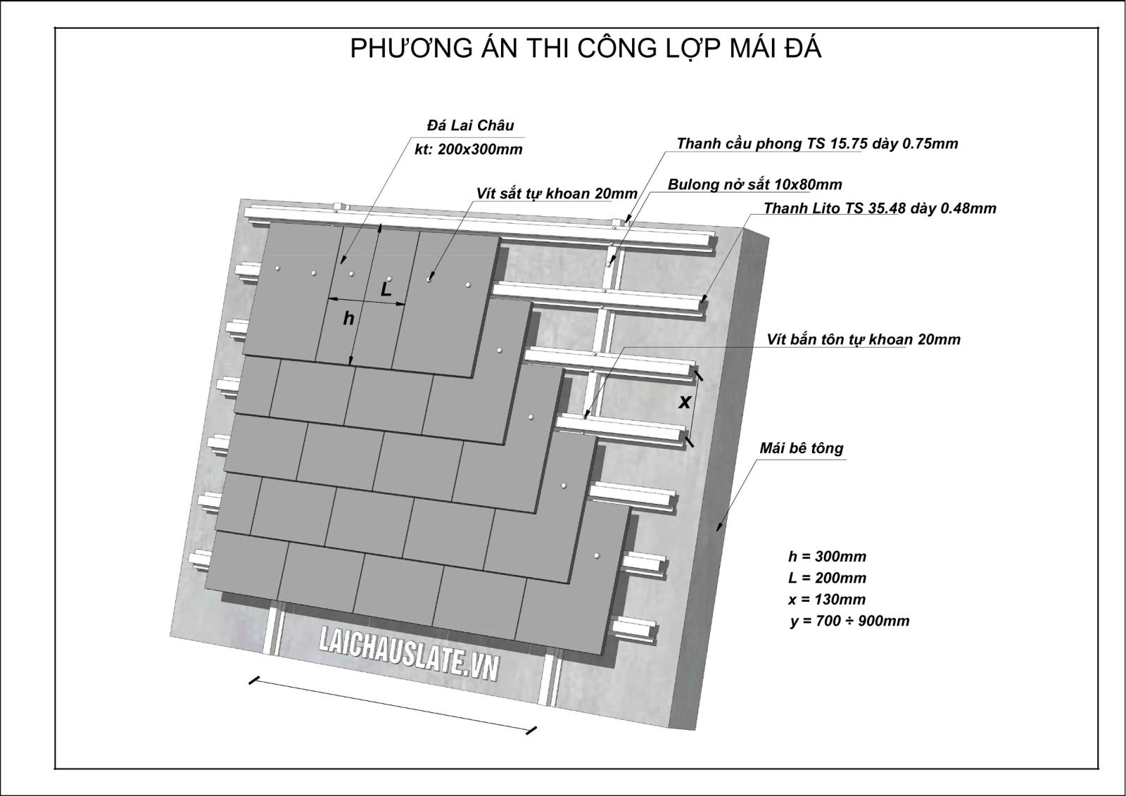 - Liên kết giữa ngói đá và lito bằng vít 2cm. Mỗi viên ngói bắn 2 vít.
